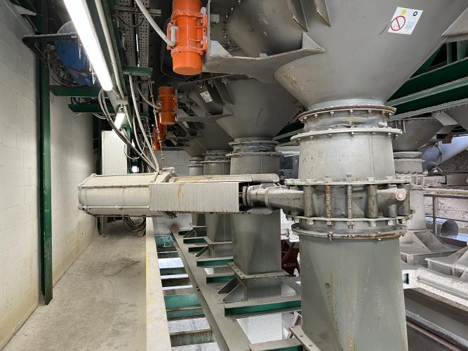 A potash mine has a railway complex for loading wagons with potash and salt. The loading of each wagon must be carried out by opening (4x) DN 600 knife gate valves, in a time of between 50 and 60 seconds. ORBINOX proposes installing pneumatically actuated XC hopper-type valves with a safety air tank in case of failure.